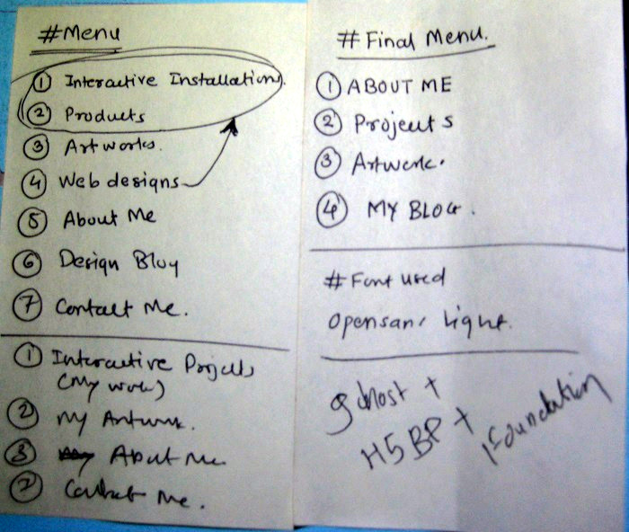 I thought about content – I decided to put videos, photographs and text related to my projects because my primary focus was on projects and its content. I filled dozens of pages with hand-written content and finalized quality content. I wanted to keep all my projects open source, hence I have written about it from concept generation to implementation making this portfolio filled with text, photographs and videos. I tried to find out my own qualities and skills which I need to highlight while deciding contents for about page. I tried to get these content verified.